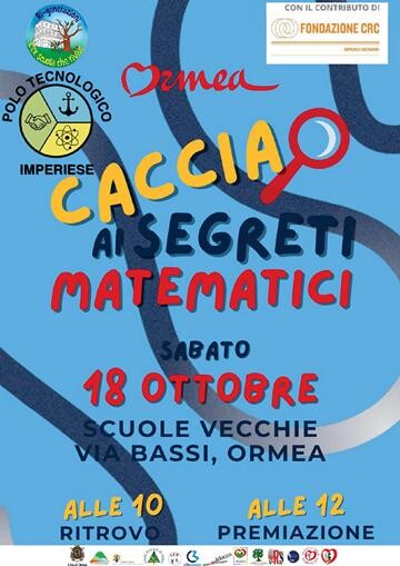 Laboratorio gratuito di matematica organizzato in collaborazione con il Polo Tecnologico Imperiese presso le scuole vecchie di Ormea in Via Bassi. Ritrovo ore 10:00. Premiazione ore 12:00.